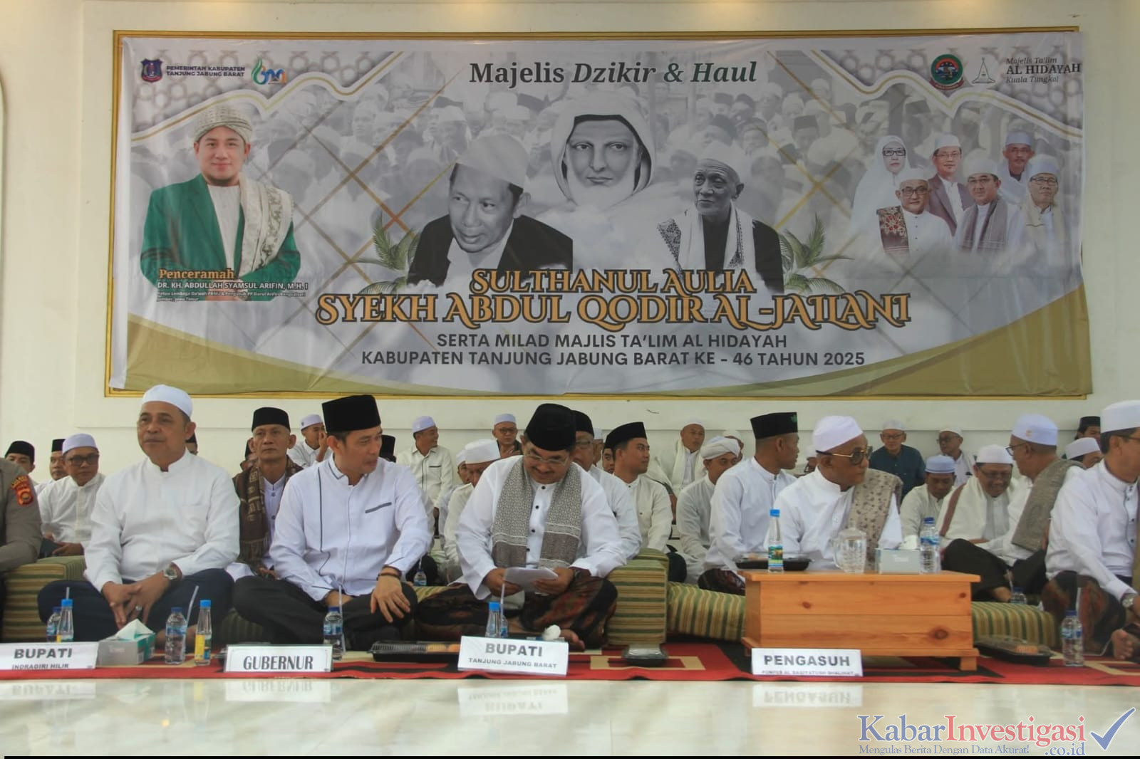 Tanjab Barat. Kabarinvestigasi. Co. Id. Bupati Tanjung Jabung Barat, Drs. H. Anwar Sadat, M.Ag. menegaskan bahwa pelaksanaan Haul Sultanul Aulia Syekh Abdul Qodir Al-Jailani tidak hanya bernilai ibadah, tetapi juga menjadi media silaturahmi, penguatan wisata religi, sekaligus membawa dampak positif bagi perekonomian masyarakat. Hal ini ia sampaikan saat menghadiri Majelis Dzikir dan Haul Syekh Abdul Qodir Al-Jailani yang dirangkaikan dengan Milad Majelis Ta’lim Al Hidayah ke-46 di Pondok Pesantren Al-Baqiyatush Shalihat Kuala Tungkal, Kamis (2/10).