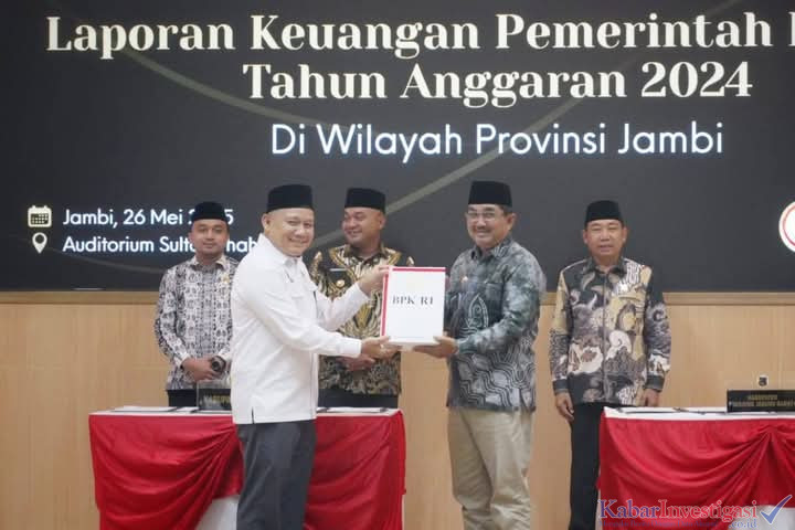 Jambi .kabarinvestigasi.co.id.Pemerintah Kabupaten Tanjung Jabung Barat kembali mengukir prestasi membanggakan di kancah pengelolaan keuangan daerah. Dalam acara penyampaian Laporan Hasil Pemeriksaan (LHP) atas Laporan Keuangan Pemerintah Daerah (LKPD) Tahun Anggaran 2024 yang digelar oleh Badan Pemeriksa Keuangan (BPK) Perwakilan Provinsi Jambi, Kabupaten Tanjung Jabung Barat kembali meraih Opini Wajar Tanpa Pengecualian (WTP) untuk yang ketujuh kalinya secara berturut-turut.