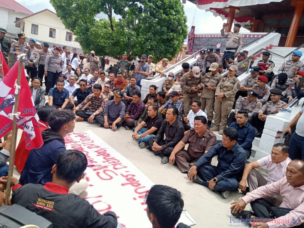 Ketua DPRD Taput, Arifin Rudi Nababan,Wakil Ketua Dedi Hendra Hutabarat, Reguel Simanjuntak bersama anggota dewan , Kapolres Taput AKBP Ernis Sitinjak mendengarkan dan menyimak aspirasi dari massa pendemo yang bernaung dibawah bendera GMNI.