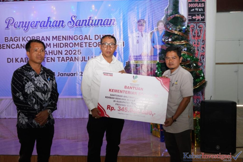 Tarutung. Kabarinvestigasi. Co. Id. Bupati Tapanuli Utara Dr. Jonius Taripar Parsaoran Hutabarat, S.Si, M.Si menyerahkan santunan kepada 23 ahli waris korban meninggal dunia akibat bencana hidrometeorologi yang terjadi sepanjang tahun 2025 di Kabupaten Tapanuli Utara bertempat di Kantor Dekranasda Kabupaten Tapanuli Utara, Tarutung. (Sabtu, 24 Januari 2026).